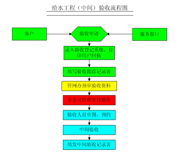 給水管道安裝完畢、試壓自檢合格、驗收資料(見附表2)經(jīng)審查合格,我公司方可安排現(xiàn)場驗收。